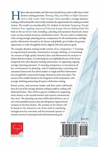 Higher education leaders and their teams should always seek to add value to their decision-making processes. Planning, Policy, and Politics in Higher Education: Tools to Help Leaders Make Strategic Choices provides a strategic decision-making model and specific tools to help maximize the opportunities for making successful choices. The model was introduced by Dr. Anderes in the book Navigating Through Turbulent Times: Applying a System and University Strategic Decision Making Model. It is built on the use of new tools, including a planning and assessment framework, future scans, an issue analysis inventory, and decision matrix. The new tools in combination with a strong strategic planning process, transparency for all constituencies, and high quality information focused on the future and globally gives leaders the greatest opportunity to make thoughtful choices aligned with their primary goals. The strategic decision-making model consists of six components: 1) Creating an organizational mentality committed to strategic thinking, 2) maximizing the amount of high quality historical data and information for analyses to inform decision makers, 3) routinizing the use of globalized scans of the future integrated with other decision-making information, 4) supporting ongoing strategic planning processes, 5) ensuring transparency to incorporate all key constituencies in planning, and 6) implementing a planning and assessment framework that allows leaders to weigh and filter information into thoughtfully constructed strategic alternatives and action plans. The success of the model is based on the integration of all components, with strategic thinking permeating all aspects of decision making. Board, system, and university leaders and their teams will benefit from the use of the strategic decision-making model in crafting well-informed choices. They will have greater confidence in supporting those choices to the myriad internal and external constituencies they serve. The planning outcomes will be derived from a set of new and expanded resources that provide greater organizational certainty in the final choices. The certainty in the choices will be based on the exhaustive use of the tools in translating strategies into key outcomes and the increased capacity to measure success in meeting board and institutional goals.