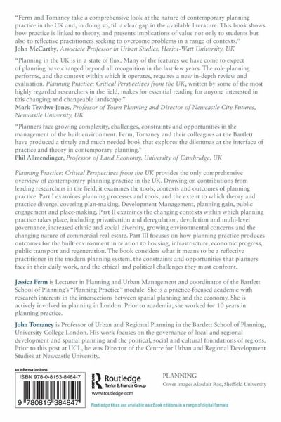 Jessica Ferm is Lecturer in Planning and Urban Management and coordinator of the Bartlett School of Planning's "Planning Practice" module. She is a practice-focused academic with research interests in the intersections between spatial planning and the economy. She is actively involved in planning in London. Prior to academia, she worked for 10 years in planning practice. John Tomaney is Professor of Urban and Regional Planning in the Bartlett School of Planning, University College London. His work focuses on the governance of local and regional development and spatial planning and the political, social and cultural foundations of regions. Prior to this post at UCL, he was Director of the Centre for Urban and Regional Development Studies at Newcastle University.