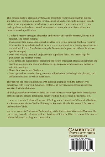 This concise guide to planning, writing, and presenting research is intended for biology students of all levels, especially those in behavioral ecology, The reader is guided through a discussion of the nature of scientific research, how to plan research, and how to obtain funding. The authors give advice and guidelines for presenting results at research seminars and scientific meetings, and also provide useful tips on preparing abstracts and posters for scientific meetings. They discuss how to write an effective C.V. and give general tips on how to write clearly. The book is illuminated throughout with personal examples from the authors' own experiences and emphasis is placed on problems associated with field studies. All biologists will find this a valuable resource and guide for the early years of their scientific careers and established faculty will find it an essential instructional tool.
