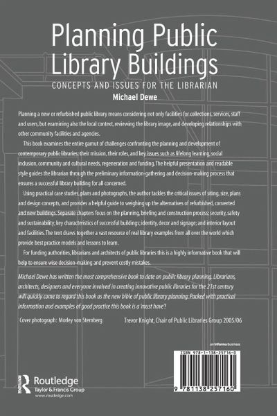 Planning a new or refurbished public library means considering not only facilities for collections, services, staff and users, but examining also the local context, reviewing the library image, and developing relationships with other community facilities and agencies. This book examines the entire gamut of challenges confronting the planning and development of contemporary public libraries; their mission, their roles, and key issues such as lifelong learning, social inclusion, community and cultural needs, regeneration and funding. The helpful presentation and readable style guides the librarian through the preliminary information-gathering and decision-making process that ensures a successful library building for all concerned. Using practical case studies, plans and photographs, the author tackles the critical issues of siting, size, plans and design concepts, and provides a helpful guide to weighing up the alternatives of refurbished, converted and new buildings. Separate chapters focus on the planning, briefing and construction process; security, safety and sustainability; key characteristics of successful buildings; identity, decor and signage; and interior layout and facilities. The text draws together a vast resource of real library examples from all over the world which provide best practice models and lessons to learn. For funding authorities, librarians and architects of public libraries this is a highly informative book that will help to ensure wise decision-making and prevent costly mistakes.