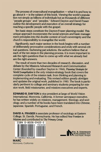 This is a print on demand book and is therefore non- returnable. Over three billion people in the world have never heard the name of Jesus Christ. The task of evangelizing these people seems monumental. In this major study of world evangelization, however, Edward Dayton and Donald Fraser view the world not as billions of individuals but as thousands of "people groups." The Dayton-Fraser strategy includes ten basic steps that analyze and define the goals in reaching these people groups and the obstacles standing in the way. Unlike other mission strategies, this approach incorporates the social sciences and basic management principles into the context of God's sovereignty and of the church's responsibility to evangelize the world. The book includes a comprehensive bibliography reflecting the authors' extensive research in theology, sociology, anthropology, and management.