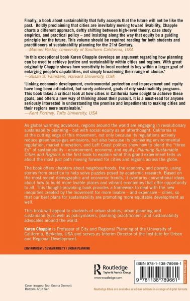As global warming advances, regions around the world are engaging in revolutionary sustainability planning - but with social equity as an afterthought. California is at the cutting edge of this movement, not only because its regulations actively reduce greenhouse gas emissions, but also because its pioneering environmental regulation, market innovation, and Left Coast politics show how to blend the "three Es" of sustainability--environment, economy, and equity. Planning Sustainable Cities and Regions is the first book to explain what this grand experiment tells us about the most just path moving forward for cities and regions across the globe. The book offers chapters about neighbourhoods, the economy, and poverty, using stories from practice to help solve puzzles posed by academic research. Based on the most recent demographic and economic trends, it overturns conventional ideas about how to build more livable places and vibrant economies that offer opportunity to all. This thought-provoking book provides a framework to deal with the new inequities created by the movement for more livable - and expensive - cities, so that our best plans for sustainability are promoting more equitable development as well. This book will appeal to students of urban studies, urban planning and sustainability as well as policymakers, planning practitioners, and sustainability advocates around the world.