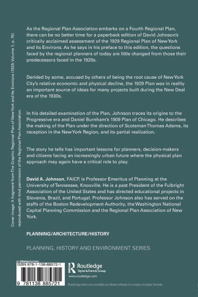 As the Regional Plan Association embarks on a Fourth Regional Plan, there can be no better time for a paperback edition of David Johnson's critically acclaimed assessment of the 1929 Regional Plan of New York and Its Environs. As he says in his preface to this edition, the questions faced by the regional planners of today are little changed from those their predecessors faced in the 1920s. Derided by some, accused by others of being the root cause of New York City's relative economic and physical decline, the 1929 Plan was in reality an important source of ideas for many projects built during the New Deal era of the 1930s. In his detailed examination of the Plan, Johnson traces its origins to Progressive era and Daniel Burnham's 1909 Plan of Chicago. He describes the making of the Plan under the direction of Scotsman Thomas Adams, its reception in the New York Region, and its partial realization. The story he tells has important lessons for planners, decision-makers and citizens facing an increasingly urban future where the physical plan approach may again have a critical role to play.