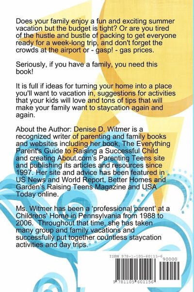 Does your family enjoy a fun and exciting summer vacation but the budget is tight? Or are you tired of the hustle and bustle of packing to get everyone ready for a week-long trip, and don't forget the crowds at the airport or - gasp! - gas prices. Seriously, if you have a family, you need this book! It is full if ideas for turning your home into a place you'll want to vacation in, suggestions for activities that your kids will love and tons of tips that will make your family want to staycation again and again. Denise D. Witmer is a recognized writer of parenting and family books and sites including her book, The Everything Parent's Guide to Raising a Successful Child and site About.com Parenting Teens. She has worked at a Children Home in Pennsylvania and has taken many group and family vacations and successfully put together countless staycation activities and day trips. She is trained in Parent Effectiveness Training, Support & Training for Exceptional Parents and is the mother of three children.
