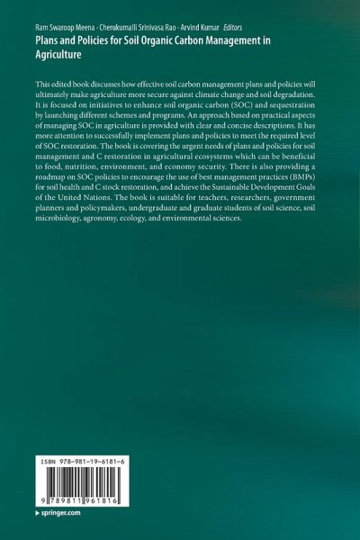 This edited book discusses how effective soil carbon management plans and policies will ultimately make agriculture more secure against climate change and soil degradation. It is focused on initiatives to enhance soil organic carbon (SOC) and sequestration by launching different schemes and programs. An approach based on practical aspects of managing SOC in agriculture is provided with clear and concise descriptions. It has more attention to successfully implement plans and policies to meet the required level of SOC restoration. The book is covering the urgent needs of plans and policies for soil management and C restoration in agricultural ecosystems which can be beneficial to food, nutrition, environment, and economy security. There is also providing a roadmap on SOC policies to encourage the use of best management practices (BMPs) for soil health and C stock restoration, and achieve the Sustainable Development Goals of the United Nations. The book is suitable for teachers, researchers, government planners and policymakers, undergraduate and graduate students of soil science, soil microbiology, agronomy, ecology, and environmental sciences.