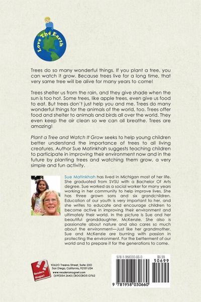 Trees do so many wonderful things. If you plant a tree, you can watch it grow. Because trees live for a long time, that very same tree will be alive for many years to come! Trees shelter us from the rain, and they give shade when the sun is too hot. Some trees, like apple trees, even give us food to eat. But trees don't just help you and me. Trees do many wonderful things for the animals of the world, too. Trees offer food and shelter to animals and birds all over the world. They even keep the air clean so we can all breathe. The trees are amazing! Plant a Tree and Watch It Grow seeks to help young children better understand the importance of trees to all living creatures. Author Sue Matinkhah suggests teaching children to participate in improving their environment now and in the future by planting trees and watching them grow, a very simple and fun activity.