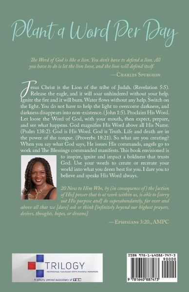 The Word of God is like a lion. You don't have to defend a lion. All you have to do is let the lion loose, and the lion will defend itself. -- Charles Spurgeon Jesus Christ is the Lion of the tribe of Judah. (Revelation 5:5). Release the eagle, and it will soar unhindered without your help. Ignite the fire and it will burn. Water flows without any help. Switch on the light. You do not have to help the light to overcome darkness, and darkness disappears into non-existence. ( John 1:5). Proclaim His Word. Let loose the Word of God, with your mouth, then expect, prepare, and see what happens. God magnifies His Word above all His Name. (Psalm 138:2). God is His Word. God is Truth. Life and death are in the power of the tongue. (Proverbs 18:21). So what are you creating? When you say what God says, He issues His commands, angels go to work and The Blessings commanded manifests. This book envisioned is to inspire, ignite and impact a boldness that trusts God. Use your words to create or recreate your world into what you deem best for you. I dare you to believe and speaks His Word always. 20 Now to Him Who, by (in consequence of ) the [action of His] power that is at work within us, is able to [carry out His purpose and] do superabundantly, far over and above all that we [dare] ask or think [infinitely beyond our highest prayers, desires, thoughts, hopes, or dreams] -- Ephesians 3:20., AMPC