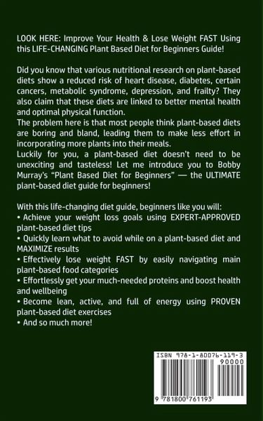 LOOK HERE: Improve Your Health & Lose Weight FAST Using this LIFE-CHANGING Plant Based Diet for Beginners Guide! Did you know that various nutritional research on plant-based diets show a reduced risk of heart disease, diabetes, certain cancers, metabolic syndrome, depression, and frailty? They also claim that these diets are linked to better mental health and optimal physical function. The problem here is that most people think plant-based diets are boring and bland, leading them to make less effort in incorporating more plants into their meals. Luckily for you, a plant-based diet doesn't need to be unexciting and tasteless! Let me introduce you to Bobby Murray's "Plant Based Diet for Beginners" - the ULTIMATE plant-based diet guide for beginners! With this life-changing diet guide, beginners like you will:Achieve your weight loss goals using EXPERT-APPROVED plant-based diet tips Quickly learn what to avoid while on a plant-based diet and MAXIMIZE results Effectively lose weight FAST by easily navigating main plant-based food categories Effortlessly get your much-needed proteins and boost health and wellbeing Become lean, active, and full of energy using PROVEN plant-based diet exercises And so much more! This life-changing guide is filled with PROVEN tips and advice that will allow you to reap all the health benefits of a plant-based diet! In easy-to-understand terms, women and men like you will be guided on how to boost weight loss EFFORTLESSLY! PLUS, you won't have to give up good food! There are plenty of delicious recipes included! Scroll up, Click on "Buy Now", and Boost Your Health Today!
