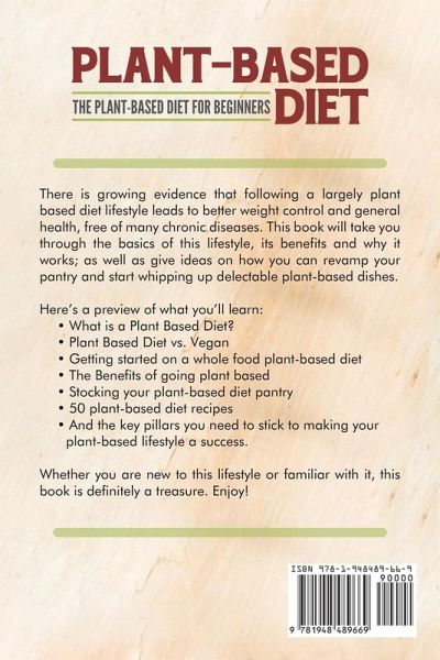 Plant-Based Diet: The Plant-Based Diet for Beginners There is growing evidence that following a largely plant-based diet lifestyle leads to better weight control and general health, free of many chronic diseases. This book will take you through the basics of this lifestyle, its benefits and why it works; as well as give ideas on how you can revamp your pantry and start whipping up delectable plant-based dishes. Here’s a preview of what you’ll learn: What is a Plant-Based Diet? Plant-Based Diet vs. Vegan Getting started on a whole food plant-based diet The Benefits of going plant-based Stocking your plant-based diet pantry 50 plant-based diet recipes And the key pillars you need to stick to making your plant-based lifestyle a success. Whether you are new to this lifestyle or familiar with it, this book is definitely a treasure. Enjoy! Scroll up to the top of the page, click on the BUY NOW button and learn how you can live healthier and feel better with the plant-based diet!