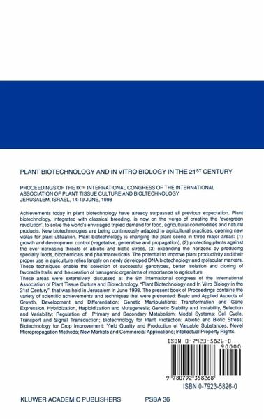 These areas were extensively discussed at the 9th international congress of the International Association of Plant Tissue Culture and Biotechnology, `Plant Biotechnology and In Vitro Biology in the 21st Century', which was held in Jerusalem in June 1998. The present book of proceedings contains the variety of scientific achievements and techniques that were presented: Basic and Applied Aspects of Growth, Development and Differentiation; Genetic Manipulations: Transformation and Gene Expression, Hybridization, Haploidization and Mutagenesis; Genetic Stability and Instability, Selection and Variability; Regulation of Primary and Secondary Metabolism; Model Systems: Cell Cycle, Transport and Signal Transduction; Biotechnology for Plant Protection: Abiotic and Biotic Stress; Biotechnology for Crop Improvement: Yield, Quality and Production of Valuable Substances; Novel Micropropagation Methods; New Markets and Commercial Applications; Intellectual Property Rights.