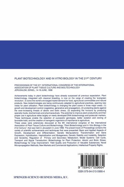 These areas were extensively discussed at the 9th international congress of the International Association of Plant Tissue Culture and Biotechnology, `Plant Biotechnology and In Vitro Biology in the 21st Century', which was held in Jerusalem in June 1998. The present book of proceedings contains the variety of scientific achievements and techniques that were presented: Basic and Applied Aspects of Growth, Development and Differentiation; Genetic Manipulations: Transformation and Gene Expression, Hybridization, Haploidization and Mutagenesis; Genetic Stability and Instability, Selection and Variability; Regulation of Primary and Secondary Metabolism; Model Systems: Cell Cycle, Transport and Signal Transduction; Biotechnology for Plant Protection: Abiotic and Biotic Stress; Biotechnology for Crop Improvement: Yield, Quality and Production of Valuable Substances; Novel Micropropagation Methods; New Markets and Commercial Applications; Intellectual Property Rights.