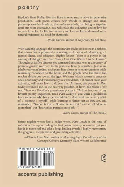 Accents Publishing is proud to present Plant Daddy, Renée Rigdon's debut poetry collection. Vulnerability, strength and introspection interlink in the singular voice of this book and the poems in it sing of growth through a journey of acceptance and change.