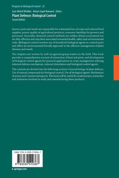 Insects, pests and weeds are responsible for substantial loss of crops and reduced food supplies, poorer quality of agricultural products, economic hardship for growers and processor. Generally, chemical control methods are neither always economical nor are they effective and may have associated unwanted health, safety and environmental risks. Biological control involves use of beneficial biological agents to control pests and offers an environmental friendly approach to the effective management of plant diseases and weeds. The chapters are written by well recognized group leaders in the field. This book provides a comprehensive account of interaction of host and pests, and development of biological control agents for practical applications in crops management utilizing inherent defence mechanism, induced stimulation and biological control agents. The contents are divided into the following sections: General biology of plant defence, Use of natural compounds for biological control, Use of biological agents, Mechanism of action and Commercial aspects. The book will be useful for academicians, researcher and industries involved in study and manufacturing these products.