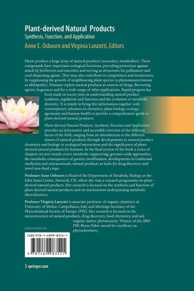 Plant-derived natural products: synthesis, function and application provides an informative and accessible overview of the different facets of the field, ranging from an introduction to the different classes of natural products through developments in natural product chemistry and biology to ecological interactions and the significance of plant-derived natural products for humans. In the final section of the book a series of chapters on new trends covers metabolic engineering, genome-wide approaches, the metabolic consequences of genetic modification, developments in traditional medicines and nutraceuticals, natural products as leads for drug discovery and novel non-food crops.