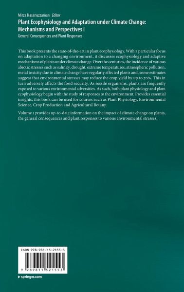 1. Climate change influences the interactive effects of the simultaneous impact of abiotic and biotic stresses on plants.- 2. Loss of Agro Bio-Diversity and Productivity Due To Climate Change in Continent Asia: A Review.- 3. Stress Implications and Crop Productivity.- 4. Impact of Climate Change on Postharvest Physiology of Edible Plant Products.- 5. Plant adaption and tolerance to environmental stresses: mechanisms and perspective.- 6. Crop growth responses towards elevated atmospheric CO2 environment.- 7. Coping with saline environment: learning from halophytes.- 8. Ecophysiology and responses of plants under drought.- 9. Strategies for drought tolerance in xerophytes.- 10. Ecophysiology and response of plants under high temperature stress.- 11. Adaptation and tolerance of wheat to heat stress.- 12. High-temperature tolerance of flowers.- 13. Assessing the effects of high night temperature on rice photosynthetic parameters: involvement of cellular membrane damage and ethylene response.- 14. Ecophysiological Responses of Plants under Metals/ Metalloids Toxicity.- 15. Ecophysiology of plants under cadmium toxicity: Photosynthetic and physiological responses.- 16. Ecophysiology and stress responses of aquatic macrophytes under metals/metalloids toxicity.- 17. Physiological, Biochemical and Molecular Responses of the plants against enhanced Ultraviolet B and Heavy Metal stress.- 18. Impact of UV radiation on photosynthetic apparatus: Adaptive and damaging mechanisms.- 19. UV-B and UV-B/white light induced inhibition of thylakoid electron transfer reactions studied by fluorescence induction and fluorescence decay: damage to donor and acceptor side components of PSII.- 20. Climate Change and Plant Abiotic Stress: Responses, Sensing and Signaling.- 21. Plant signaling under adverse environment.- 22. Plant-based Biostumulants and Plant Stress Responses.- 23. Transcription factors and plant abiotic stress responses.- 24. Ecophysiological Adaptation of Soybeans to Latitudesthrough Photoperiodic and Growth Habit Genes.- 25. Arsenic accumulation, compartmentation and complexation in Arthrocnemum indicum.- 26. Plant-Microbe Interactions under Adverse Environment.- 27. Breeding Plants for Future Climates.- 28. Adaptive physiological responses of plants under abiotic stresses: role of phytohormones.- 29.Biochemical and Molecular mechanism of Abiotic stress Tolerance in plants.