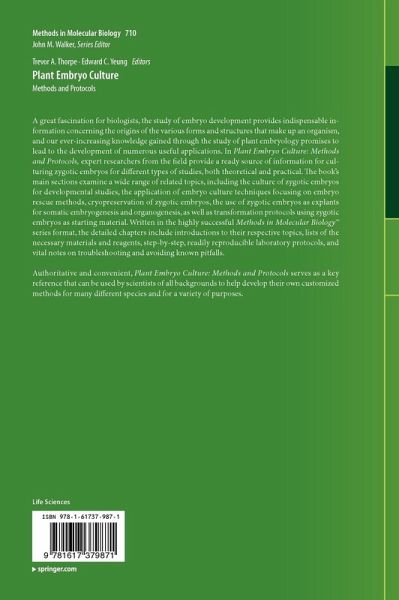 A great fascination for biologists, the study of embryo development provides indispensable information concerning the origins of the various forms and structures that make up an organism, and our ever-increasing knowledge gained through the study of plant embryology promises to lead to the development of numerous useful applications. In Plant Embryo Culture: Methods and Protocols, expert researchers from the field provide a ready source of information for culturing zygotic embryos for different types of studies, both theoretical and practical. The book's main sections examine a wide range of related topics, including the culture of zygotic embryos for developmental studies, the application of embryo culture techniques focusing on embryo rescue methods, cryopreservation of zygotic embryos, the use of zygotic embryos as explants for somatic embryogenesis and organogenesis, as well as transformation protocols using zygotic embryos as starting material. Written in the highly successful Methods in Molecular Biology(TM) series format, the detailed chapters include introductions to their respective topics, lists of the necessary materials and reagents, step-by-step, readily reproducible laboratory protocols, and vital notes on troubleshooting and avoiding known pitfalls.Authoritative and convenient, Plant Embryo Culture: Methods and Protocols serves as a key reference that can be used by scientists of all backgrounds to help develop their own customized methods for many different species and for a variety of purposes.