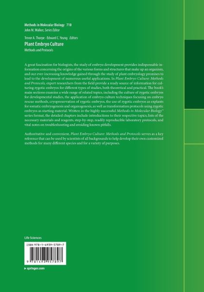A great fascination for biologists, the study of embryo development provides indispensable information concerning the origins of the various forms and structures that make up an organism, and our ever-increasing knowledge gained through the study of plant embryology promises to lead to the development of numerous useful applications. In Plant Embryo Culture: Methods and Protocols, expert researchers from the field provide a ready source of information for culturing zygotic embryos for different types of studies, both theoretical and practical. The book's main sections examine a wide range of related topics, including the culture of zygotic embryos for developmental studies, the application of embryo culture techniques focusing on embryo rescue methods, cryopreservation of zygotic embryos, the use of zygotic embryos as explants for somatic embryogenesis and organogenesis, as well as transformation protocols using zygotic embryos as starting material. Written in the highly successful Methods in Molecular Biology(TM) series format, the detailed chapters include introductions to their respective topics, lists of the necessary materials and reagents, step-by-step, readily reproducible laboratory protocols, and vital notes on troubleshooting and avoiding known pitfalls.Authoritative and convenient, Plant Embryo Culture: Methods and Protocols serves as a key reference that can be used by scientists of all backgrounds to help develop their own customized methods for many different species and for a variety of purposes.