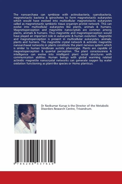 The nanoarchaea can symbiose with actinobacteria, cyanobacteria, magnetotactic bacteria & spirochetes to form magnetotactic eukaryotes which would have evolved into multicellular magnetotactic eukaryotes called as magnetotactic symbiotic tissue organism protist network. This can evolve into multicellular eukaryotes like plants, animals & humans. Magnetoperception and magnetite nanocrystals are common among plants, animals & humans. Thus magnetite and magnetoperception would have played an important role in eukaryotic & human evolution. Magnetite and magnetoperception is present in multicellular eukaryotes, animals, plants and humans. The magnetite crystal network & actinidic magnetite nanoarchaeal networks in plants constitute the plant nervous system which is similar to human hindbrain autistic phenotype. Plants are capable of magnetoperception & quantal perception. The plant consciousness & intelligence can evolve into intelligent plant social structures with communication abilities. Human beings with global warming related actinidic magnetite nanocrystal networks can generate oxygen by water oxidation functioning as plant-like species or Homo planticus.