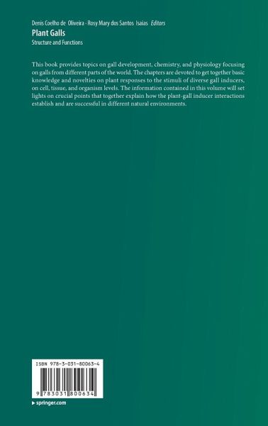 Preface.- Chapter 1 Meristematic features influence on gall development.- Chapter 2 What transcriptomics can and cannot tell us about insect gall development.- Chapter 3 Epidermis: the first line of contact between plants and gall-inducing herbivores.- Chapter 4 Patterns of xylem (re)differentiation and distribution in galls.- Chapter 5 The protagonism of phloem in gall development.- Chapter 6 Starch - histolocalization and metabolism in plant galls.- Chapter 7 Histochemical overview of primary metabolites in galls: tissue compartmentalization and taxon-related traits.- Chapter 8 Green galls can photosynthesize: gall metabolism and host organ impact.- Chapter 9 Physiological and biochemical properties of aphid galls.- Chapter 10 Plant galls: implications for the chemical profile and biological activity of their host plants.- Chapter 11 Structural and physiological aspects of Aphid-induced galls.- Chapter 12 Eriophyoid mite galls: from structural complexity to economic impact.- Chapter 13 Structural and functional diversity of neotropical psyllid galls (Hemiptera: Psylloidea) refute the "simplicity" hypothesis.- Chapter 14 A complex but few explored structure and function of Lepidoptera galls.- Chapter 15 Structure and functions of oak gall wasps.- Chapter 16 The structural development and functional traits of Diptera-induced galls.- Chapter 17 Exploring the intriguing characteristics of eriococcid-induced galls.- Chapter 18 Plant volatile organic compounds' cues in gall induction: In the search for a semiochemical framework considering developmental emergent properties and ecological context dependency.- Chapter 19 The physiological and ecological processes of anthocyanins accumulation and red gall coloration.- Chapter 20 Natural Enemies' influence on the population, structure, and function of insect-induced galls.