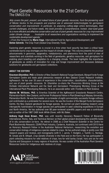 Kioumars Ghamkhar, PhD, is Director of New Zealand's National Forage Genebank, Margot Forde Forage Germplasm Centre and leads plant phenomics research at New Zealand Crown Research Institute, AgResearch. He has over 20 years of experience in the conservation, classification, characterization, and use of plant genetic resources. Dr. Ghamkhar co-chairs the Phenomics Working Group at the DivSeek International Network and the Seed and Germplasm Phenotyping Working Group at the International Plant Phenotyping Network. He is an associate editor with Frontiers in Plant Science. Warren M. Williams, PhD, is Emeritus Scientist of the AgResearch Grasslands Research Centre, Palmerston North, New Zealand, and former Professorial Fellow in Plant Breeding at Massey University, Palmerston North. He was the breeder or co-breeder of eight commercially successful forage cultivars and contributed as a prebreeder for several more. He was the Curator of the Margot Forde Germplasm Centre, the New Zealand genebank for forage species. He carried out plant breeding research using interspecific hybridization in forage species and participated in seed collecting expeditions in Europe and North America. He has authored over 80 peer-reviewed scientific papers and was a contributor and co-editor of the 1987 CABI book White Clover, with MJ Baker. Anthony Hugh Dean Brown, PhD, was until recently Honorary Research Fellow of Bioversity International, Rome, Italy, and Technical Advisor on their global project developing the scientific basis of in situ conservation on-farm. He retired in 2006 as a Chief Research Scientist in the Centre for Plant Biodiversity Research, CSIRO Plant Industry, Canberra, Australia, but continued until 2015 there as Honorary Research Fellow in the Australian National Herbarium, researching the evolution and conservation biology of indigenous species related to crops. He has authored singly or jointly over 200 research papers and reviews, and monographs (with D. I. Jarvis, T. Hodgkin, J. Tuxhill, I.L. Noriega, M. Smale and B. Sthapit, Crop Genetic Diversity in the Field and on the Farm). He has participated in plant collecting missions for wild relatives of crops, two for wild barley (Israel, Iran) and six for wild Glycine and Gossypium in many regions of Australia. He was curator of the Australian Plant Genetics Resources Centre for Indigenous wild relatives of crops.