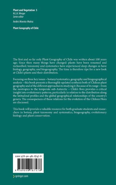 The first and so far only Plant Geography of Chile was written about 100 years ago, since when many things have changed: plants have been renamed and reclassified; taxonomy and systematics have experienced deep changes as have biology, geography, and biogeography. The time is therefore ripe for a new look at Chile's plants and their distribution.