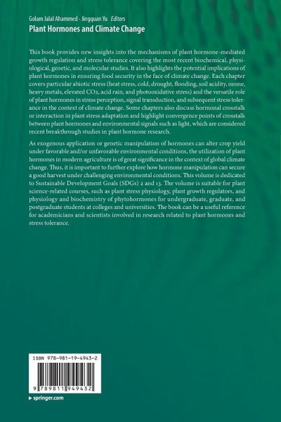 As exogenous application or genetic manipulation of hormones can alter crop yield under favorable and/or unfavorable environmental conditions, the utilization of plant hormones in modern agriculture is of great significance in the context of global climate change. Thus, it is important to further explore how hormone manipulation can secure a good harvest under challenging environmental conditions. This volume is dedicated to Sustainable Development Goals (SDGs) 2 and 13. The volume is suitable for plant science-related courses, such as plant stress physiology, plant growth regulators, and physiology and biochemistry of phytohormones for undergraduate, graduate, and postgraduate students at colleges and universities. The book can be a useful reference for academicians and scientists involved in research related to plant hormones and stress tolerance.
