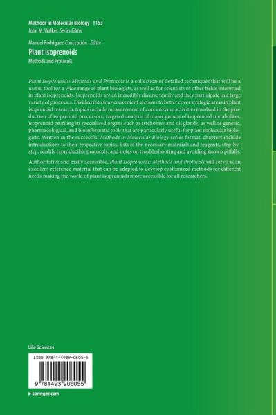 Authoritative and easily accessible, Plant Isoprenoids: Methods and Protocols will serve as an excellent reference material that can be adapted to develop customized methods for different needs making the world of plant isoprenoids more accessible for all researchers.