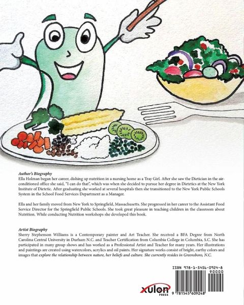 Author's Biography Ella Holman began her career, dishing up nutrition in a nursing home as a Tray Girl. After she saw the Dietician in the air-conditioned office she said, "I can do that", which was when she decided to pursue her degree in Dietetics at the New York Institute of Dietetic. After graduating she worked at several hospitals then she transitioned to the New York Public Schools System in the School Food Services Department as a Manager. Ella and her family moved from New York to Springfield, Massachusetts. She progressed in her career to the Assistant Food Service Director for the Springfield Public Schools. She took great pleasure in teaching children in the classroom about Nutrition. While conducting Nutrition workshops she developed this book. Artist Biography Sherry Stephenson Williams is a Contemporary painter and Art Teacher. She received a BFA Degree from North Carolina Central University in Durham N.C. and Teacher Certification from Columbia College in Columbia, S.C. She has participated in many group shows and has worked as a Professional Artist and Teacher for many years. Her illustrations and paintings are created using watercolors, acrylics and oil paints. Her signature works consist of bright, earthy colors and images that explore the relationship between nature, her beliefs and culture. She currently resides in Greensboro, N.C.