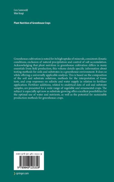 Greenhouse cultivation is noted for its high uptake of minerals, consistent climatic conditions, exclusion of natural precipitation and control of salt accumulation. Acknowledging that plant nutrition in greenhouse cultivation differs in many essentials from field production, this volume details specific information about testing methods for soils and substrates in a greenhouse environment. It does so while offering a universally applicable analysis. This is based on the composition of the soil and substrate solutions, methods for the interpretation of tissue tests, and crop responses on salinity and water supply in relation to fertilizer application. Fertilizer additions, related to analytical data of soil and substrate samples, are presented for a wide range of vegetable and ornamental crops. The subject is especially apt now as substrate growing offers excellent possibilities for the optimal use of water and nutrients, as well as the potential for sustainable production methods for greenhouse crops.