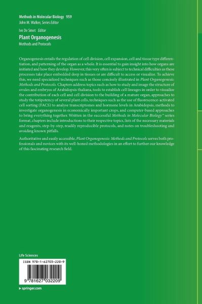 Organogenesis entails the regulation of cell division, cell expansion, cell and tissue type differentiation, and patterning of the organ as a whole. It is essential to gain insight into how organs are initiated and how they develop. However, this very often is subject to technical difficulties as these processes take place embedded deep in tissues or are difficult to access or visualize. To achieve this, we need specialized techniques such as those concisely illustrated in Plant Organogenesis: Methods and Protocols. Chapters address topics such as how to study and image the structure of ovules and embryos of Arabidopsis thaliana, tools to establish cell lineages in order to visualize the contribution of each cell and cell division to the building of a mature organ, approaches to study the totipotency of several plant cells, techniques such as the use of fluorescence-activated cell sorting (FACS) to analyse transcriptomes and hormone levels in Arabidopsis, methods to investigate organogenesis in economically important crops, and computer-based approaches to bring everything together. Written in the successful Methods in Molecular Biology(TM) series format, chapters include introductions to their respective topics, lists of the necessary materials and reagents, step-by-step, readily reproducible protocols, and notes on troubleshooting and avoiding known pitfalls.