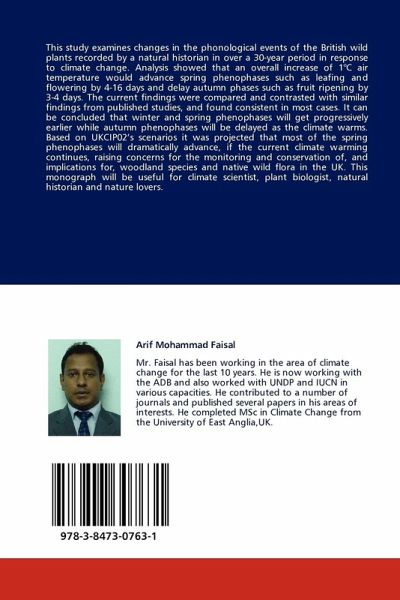 This study examines changes in the phonological events of the British wild plants recorded by a natural historian in over a 30-year period in response to climate change. Analysis showed that an overall increase of 1°C air temperature would advance spring phenophases such as leafing and flowering by 4-16 days and delay autumn phases such as fruit ripening by 3-4 days. The current findings were compared and contrasted with similar findings from published studies, and found consistent in most cases. It can be concluded that winter and spring phenophases will get progressively earlier while autumn phenophases will be delayed as the climate warms. Based on UKCIP02 s scenarios it was projected that most of the spring phenophases will dramatically advance, if the current climate warming continues, raising concerns for the monitoring and conservation of, and implications for, woodland species and native wild flora in the UK. This monograph will be useful for climate scientist, plant biologist, natural historian and nature lovers.