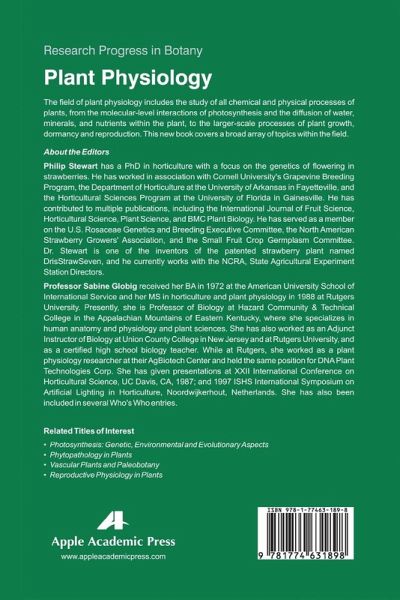 Dr. Philip Stewart has a Ph.D in horticulture with a focus on the genetics of flowering in strawberries. He has worked in association with Cornell University's Grapevine Breeding Program, the Department of Horticulture at the University of Arkansas in Fayetteville, and the Horticultural Sciences Program at the University of Florida in Gainesville. He has contributed to multiple publications, including the International Journal of Fruit Science, Horticultural Science, Plant Science, and BMC Plant Biology. He has served as a member on the U.S. Rosaceae Genetics and Breeding Executive Committee, the North American Strawberry Growers' Association, and the Small Fruit Crop Germplasm Committee. Dr. Stewart is one of the inventors of the patented strawberry plant named drisstrawseven, and he currently works with the North Central Regional Association of State Agricultural Experiment Station Directors. Professor Sabine Globig received her BA in 1972 at the American University School of International Service and her MS in horticulture and plant physiology in 1988 at Rutgers University, the State University of New Jersey. Presently, she is Professor of Biology at Hazard Community & Technical College in the Appalachian Mountains of eastern Kentucky, where she specializes in human anatomy and physiology and plant sciences. She has also worked as an Adjunct Instructor of Biology at Union County College in New Jersey and at Rutgers University, as well as a certified high school biology teacher. While at Rutgers, she worked as a plant physiology researcher at their AgBiotech Center and held the same position for DNA Plant Technologies Corporation. She has given presentations at XXII International Conference on Horticultural Science, UC Davis, California, 1987; and 1997 International Society for Horticultural Science's International Symposium on Artificial Lighting in Horticulture, Noordwijkerhout, Netherlands. She has also been included in several Who's Who entries.