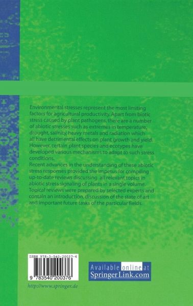 Environmental stresses represent the most limiting factors for agricultural productivity. Apart from biotic stress caused by plant pathogens, there are a number of abiotic stresses such as extremes in temperature, drought, salinity, heavy metals and radiation which all have detrimental effects on plant growth and yield. However, certain plant species and ecotypes have developed various mechanisms to adapt to such stress conditions. Recent advances in the understanding of these abiotic stress responses provided the impetus for compiling up-to-date reviews discussing all relevant topics in abiotic stress signaling of plants in a single volume. Topical reviews were prepared by selected experts and contain an introduction, discussion of the state of the art and important future tasks of the particular fields.
