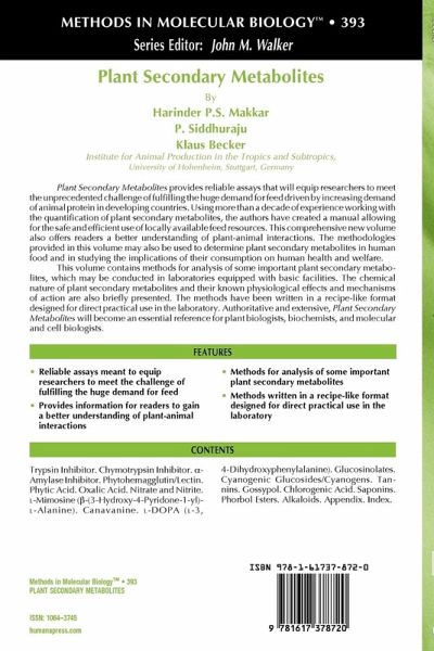 Plant Secondary Metabolites provides reliable assays that will equip researchers to meet the unprecedented challenge of fulfilling the huge demand for feed driven by increasing demand of animal protein in developing countries. Using more than a decade of experience working with the quantification of plant secondary metabolites, the authors have created a manual allowing for the safe and efficient use of locally available feed resources. This comprehensive new volume also offers readers a better understanding of plant-animal interactions. The methodologies provided in this volume may also be used to determine plant secondary metabolites in human food and in studying the implications of their consumption on human health and welfare.