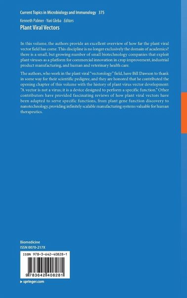 Preface.- A personal history of virus-based vector construction by William O. Dawson.- Virus-derived ssDNA vectors for the expression of foreign proteins in plants by Edward P. Rybicki and Darrin P. Martin.- Plant Viral Epitope Display Systems for Vaccine Development by Denis Leclerc.- Applications of plant viruses in bionanotechnology by George P. Lomonossoff and David J. Evans.- Milestones in the development and applications of plant virus vector as gene silencing platforms.- by Christophe Lacomme.- Emerging Antibody-based Products by Kevin J. Whaley, Josh Morton, Steve Hume, Ernie Hiatt, Barry Bratcher, Victor Klimyuk, Andrew Hiatt, Michael Pauly, and Larry Zeitlin.- Production of Recombinant Antigens and Antibodies in Nicotiana benthamiana Using 'magnifection' Technology: GMP-Compliant Facilities for Small-and Large-Scale Manufacturing by Victor Klimyuk, Gregory Pogue, Stefan Herz, John Butler, and Hugh Haydon.- Plant viral vectors for delivery by Agrobacterium by Yuri Y. Gleba,Daniel Tusé and Anatoli Giritch.- Subject index.