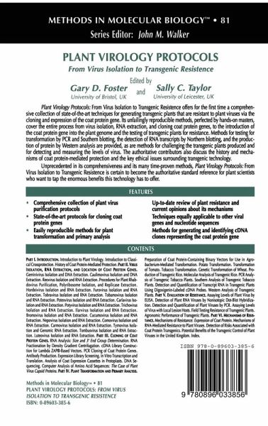 to Plant Virology.- to Classical Crossprotection.- History of Coat Protein-Mediated Protection.- Virus Isolation, RNA Extraction, and Location of Coat Protein Genes.- Geminivirus Isolation and DNA Extraction.- Caulimovirus Isolation and DNA Extraction.- Reovirus Isolation and RNA Extraction.- Procedures for Plant Rhabdovirus Purification, Polyribosome Isolation, and Replicase Extraction.- Hordeivirus Isolation and RNA Extraction.- Furovirus Isolation and RNA Extraction.- Tobravirus Isolation and RNA Extraction.- Tobamovirus Isolation and RNA Extraction.- Potexvirus Isolation and RNA Extraction.- Carlavirus Isolation and RNA Extraction.- Potyvirus Isolation and RNA Extraction.- Trichovirus Isolation and RNA Extraction.- Ilarvirus Isolation and RNA Extraction.- Bromovirus Isolation and RNA Extraction.- Cucumovirus Isolation and RNA Extraction.- Nepovirus Isolation and RNA Extraction.- Comovirus Isolation and RNA Extraction.- Carmovirus Isolation and RNA Extraction.- Tymovirus Isolation and Genomic RNA Extraction.- Tombusvirus Isolation and RNA Extraction.- Luteovirus Isolation and RNA Extraction.- Cloning of Coat Protein Genes.- RNA Analysis.- RNA Fractionation by Density Gradient Centrifugation.- cDNA Library Construction for the Lambda ZAP®-Based Vectors.- PCR Cloning of Coat Protein Genes.- Antibody Production.- Expression Library Screening.- In Vitro Transcription and Translation.- Analysis of Coat Protein Expression Cassettes in Protoplasts.- DNA Sequencing.- Computer Analysis of Amino Acid Sequences.- Plant Transformation and Primary Analysis.- Preparation of Coat Protein-Containing Binary Vectors for Use in Agrobacterium-Mediated Transformation.- Potato Transformation.- Transformation of Tomato.- Tobacco Transformation.- Genetic Transformation of Wheat.-Production of Transgenic Rice (Oryza sativa subspecies japonica cv. Taipei 309).- Molecular Analysis of Transgenic Rice.- PCR Analysis of Transgenic Tobacco Plants.- Southern Analysis of Transgenic Tobacco Plants.- Detection and Quantification of Transcript RNA in Transgenic Plants Using Digoxigenin-Labeled cDNA Probes.- Western Analysis of Transgenic Plants.- Evaluation of Resistance.- Assaying Levels of Plant Virus by ELISA.- Detection of Plant RNA Viruses by Nonisotopic Dot-Blot Hybridization.- Detection and Quantification of Plant Viruses by PCR.- Assaying Levels of Virus with Local Lesion Hosts.- Field Testing Resistance of Transgenic Plants.- Agronomic Performance of Transgenic Plants.- Mechanisms of Resistance.- Mechanisms of Resistance.- Mechanisms of RNA-Mediated Resistance to Plant Viruses.- Detection of Risks Associated with Coat Protein Transgenics.- Potential Benefits of the Transgenic Control of Plant Viruses in the United Kingdom.