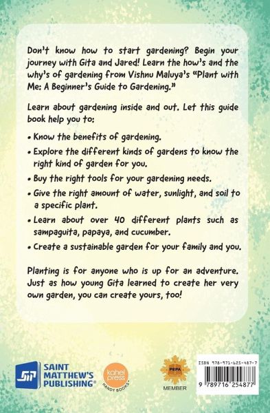 Don't know how to start gardening? Begin your journey with Gita and Jared! Learn the how's and the why's of gardening from Vishnu Maluya's "Plant with Me: A Beginner's Guide to Gardening." Learn about gardening inside and out. Let this guide book help you to: ¿ Know the benefits of gardening. ¿ Explore the different kinds of gardens to know the right kind of garden for you. ¿ Buy the right tools for your gardening needs. ¿ Give the right amount of water, sunlight, and soil to a specific plant. ¿ Learn about over 40 different plants such as sampaguita, papaya, and cucumber. ¿ Create a sustainable garden for your family and you. Planting is for anyone who is up for an adventure. Just as how young Gita learned to create her very own garden, you can create yours, too!