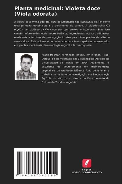 A violeta doce (Viola odorata) está documentada nas literaturas da TIM como uma primeira escolha para o tratamento do cancro. A cicloviolacina O2 (CyO2), um ciclótido da Viola odorata, tem efeitos anti-tumorais. Este livro contém informações úteis sobre botânica, ingredientes activos, utilizações medicinais e técnicas de propagação in vitro para obter plantas de elite de violeta doce. Este volume é recomendado para investigadores interessados em plantas medicinais, biotecnologia vegetal e farmacognosia.