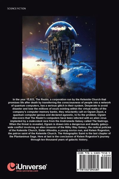 In the year 10,023, The Realm, a corporation run by the Kelemite Church that promises life after death by transferring the consciousness of people into a network of quantum computers, has a serious glitch in their system. Desperate to avoid disaster and lose the millions of souls existing within the virtual reality of the company's computer memory banks, they reluctantly call on Ogram Zepol, a quantum computer genius and declared agnostic, to fix the problem. Ogram discovers that The Realm's computers have been infected with an alien virus implanted by a malevolent race from the Andromeda Galaxy called The Nadrogs. When the threat is revealed, Ogram is drawn into a dangerous and deadly galaxy-wide conflict involving an alien invasion of the Milky Way Galaxy, the radical policies of the Kelemite Church, Sister Allondra, a young novice nun, and Kelem Rogeston, the patron saint of the Kelemite Church. The Holographic Saint is the last chapter of the Plantanimus Saga. Here at last is the conclusion of Kelem Rogeston's journey through galactic history.