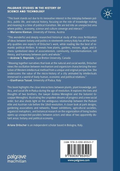 This book highlights the close interactions between plants, plant knowledge, politics, and social life in Padua during the age of revolution. It explores the lives and thoughts of two brothers, the lawyer Andrea Meneghini and the botanist GiuseppeMeneghini, illustrating the unspoken dreams of progress and a new social order, but also sheds light on the ambiguous relationship between the Paduan elite and Austrian rule before the 1848 revolution. A closer look at park designs, gardening associations and networks, fl ower exhibitions, agricultural societies, organicist metaphors, and botanical research on the organization of living bodies opens up unexpected parallels between actors and ideas of two apparently distant areas: botany and political economy.