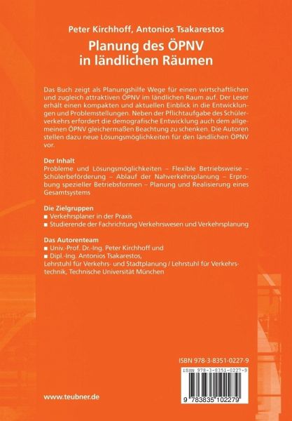 Das Buch zeigt als Planungshilfe Wege für einen wirtschaftlichen und zugleich attraktiven ÖPNV im ländlichen Raum auf. Der Leser erhält einen kompakten und aktuellen Einblick in die Entwicklungen und Problemstellungen. Neben der Pflichtaufgabe des Schülerverkehrs erfordert die demografische Entwicklung auch dem allgemeinen ÖPNV gleichermaßen Beachtung zu schenken. Die Autoren stellen dazu neue Lösungsmöglichkeiten für den ländlichen ÖPNV vor.