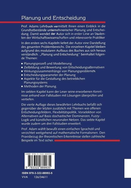 Dieses bewährte Lehrbuch vermittelt einen Einblick in die Grundlagen unternehmerischer Planung und Entscheidung. Der Autor gibt eine Darstellung des gesamten Problembereichs. Darüber hinaus können bereits erworbene Kenntnisse anhand von Fallstudien mit Lösungsvorschlägen überprüft und vertieft werden. In der 4. Auflage werden Themen wie offene Entscheidungsfelder, Flexibilitätspolitik, Vorselektion von Alternativen auf Basis stochastischer Dominanzen, Fuzzy-Logik und künstliche neuronale Netze behandelt. Zahlreiche Praxisbeispiele runden diese Darstellung ab.