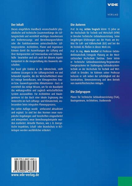 Dieses eingeführte Handbuch veranschaulicht physikalische und technische Zusammenhänge der Lüftungstechnik und vermittelt wichtiges Grundwissen wie Vorbemessungs- und Berechnungsverfahren oder die Funktionsweisen unterschiedlicher Lüftungssysteme. Architekten, Planer und Ingenieure können damit die Auswirkungen der Lüftung und ihrer Komponenten auf Innenausbau und Gebäudehülle beurteilen und sich auch bei diesem Aspekt kompetent in die Ausgestaltung des Bauwerks einschalten.Der Band gibt Einblick in die Kältetechnik, stellt moderne Lösungen in der Lüftungstechnik vor und behandelt Aspekte, die die Wirtschaftlichkeit einer RLT-Anlage beeinflussen, wie klimagerechtes Bauen bzw. bauwerksgerechtes Klimatisieren - kurz: er vermittelt das nötige Wissen, um für ein Bauobjekt das wirkungsvollste und zugleich wirtschaftlichste System auszuwählen. Für Architekten und Bauingenieure ist das Buch eine ideale Ergänzung des Unterrichts im Fach Lüftungs- und Klimatechnik, insbesondere beim integralen Planungsprozess.Die siebte Auflage wurde umfassend aktualisiert und ergänzt. So sind bei den Normen neue europäische Regelungen und Vorschriften eingearbeitet und interpretiert, neue Berechnungsbeispiele wurden erarbeitet. Aktuelle Themen, wie z. B. Energetische Inspektion, Schall- oder Brandschutz in RLT-Anlagen werden ausführlicher erläutert.