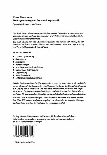 Einführung.- 1. Lineare Optimierung - Optimale Programmgestaltung.- 1.1. Vorbemerkungen.- 1.2. Die Simplex-Methode.- 1.3. Sonderfälle der Simplex-Methode.- 1.4. Praktische Anwendungsfälle der Simplex-Methode.- 1.5. Aufgaben zur Linearen Optimierung.- 1.6. Empfohlene Literatur zur Linearen Optimierung.- 2. Spezialfälle der Linearen Optimierung - Transport- und Zuordnungsoptimierung.- 2.1. Transportprobleme.- 2.2. Zuordnungsprobleme.- 2.3. Aufgaben zur Transport- und Zuordnungsoptimierung.- 2.4. Empfohlene Literatur zur Transport- und Zuordnungsoptimierung.- 3. Theorie der Spiele.- 3.1. Entscheidungstheoretische Grundlagen.- 3.2. Spieltheoretische Behandlung von Konkurrenzsituationen.- 3.3. Aufgaben zur Theorie der Spiele.- 3.4. Empfohlene Literatur zur Theorie der Spiele.- 4. Simulationstechnik.- 4.1. Zielsetzung und Verfahren.- 4.2. Stochastische Simulation mit der Monte Carlo-Technik.- 4.3. Digitale Simulation mit GPSS.- 4.4. Erfahrungen bei der Simulation.- 4.5. Aufgaben zur Simulationtechnik.- 4.6. Empfohlene Literatur zus Simulationstechnik.- 5. Warteschlangensysteme.- 5.1. Vorbemerkungen.- 5.2. Charakteristik von Warteschlangensystemen.- 5.3. Analyse verschiedener Warteschlangensysteme.- 5.4. Aufgaben zu Warteschlangenproblemen.- 5.5. Empfohlene Literatur zu Warteschlangensystemen.- 6. Kombinatorische Optimierung - Optimale Reihenfolgen.- 6.1. Vorbemerkungen.- 6.2. Rundreiseplanung.- 6.3. Ablaufplanung.- 6.4. Aufgaben zur Rundreise- und Ablaufplanung.- 6.5. Empfohlene Literatur zur Kombinatorischen Optimierung.- 7. Dynamische Optimierung.- 7.1. Vorbemerkungen.- 7.2. Einführungsbeispiele.- 7.3. Anwendung in Produktion und Lagerhaltung.- 7.4. Aufgaben zur Dynamischen Optimierung.- 7.5. Empfohlene Literatur zur Dynamischen Optimierung.- 8. OptimaleLagerhaltung.- 8.1. Vorbemerkungen.- 8.2. Bedarfsbestimmung.- 8.3. Lagerhaltungsstrategien.- 8.4. Aufgaben zur optimalen Lagerhaltung.- 8.5. Empfohlene Literatur zur optimalen Lagerhaltung.- 9. Netzplantechnik.- 9.1. Vorbemerkungen.- 9.2. Ablaufplanung - Strukturanalyse und Netzplandarstellung.- 9.3. Zeitplanung - Berechnung von Netzplänen.- 9.4. Kostenplanung.- 9.5. Kapazitätsplanung.- 9.6. Einsatz von EDV-Anlagen.- 8.7. Schlußbemerkungen.- 9.8. Aufgaben zur Netzplantechnik.- 9.9. Empfohlene Literatur zur Netzplantechnik.- 10. Entscheidungstabellen-Technik.- 10.1. Vorbemerkungen.- 10.2. Aufbau und Arten von Entscheidungstabellen.- 10.3. Untersuchung von Entscheidungstabellen.- 10.4. Aufgaben zur Entscheidungstabellen-Technik.- 10.5. Empfohlene Literatur zur Entscheidungstabellen-Technik.- Schlußbemerkungen.- Anhang Lösungen zu den Aufgaben.- Sachwortverzeichnis.