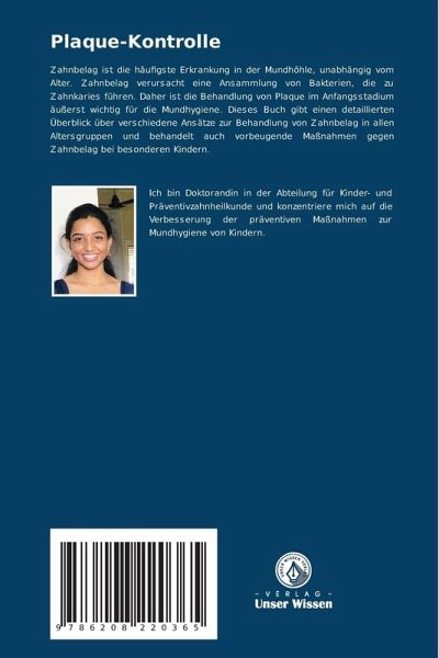 Zahnbelag ist die häufigste Erkrankung in der Mundhöhle, unabhängig vom Alter. Zahnbelag verursacht eine Ansammlung von Bakterien, die zu Zahnkaries führen. Daher ist die Behandlung von Plaque im Anfangsstadium äußerst wichtig für die Mundhygiene. Dieses Buch gibt einen detaillierten Überblick über verschiedene Ansätze zur Behandlung von Zahnbelag in allen Altersgruppen und behandelt auch vorbeugende Maßnahmen gegen Zahnbelag bei besonderen Kindern.