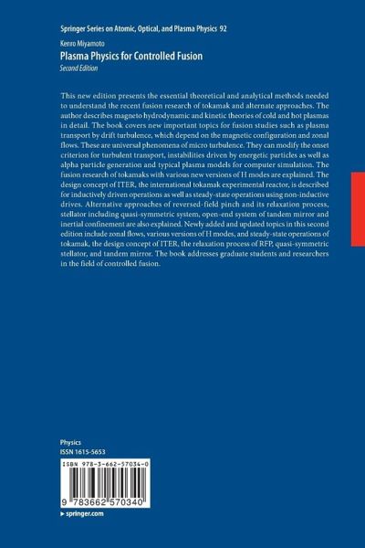 Thisnew edition presents the essential theoretical and analytical methods needed tounderstand the recent fusion research of tokamak and alternate approaches. Theauthor describes magnetohydrodynamic and kinetic theories of cold and hotplasmas in detail. The book covers new important topics for fusion studies such as plasma transportby drift turbulence, which depend on the magnetic configuration and zonal flows. These are universal phenomenaof microturbulence. They can modify the onset criterion for turbulent transport,instabilities driven by energetic particles as well as alpha particlegeneration and typical plasma models for computer simulation. The fusionresearch of tokamaks with various new versions of H modes are explained. Thedesign concept of ITER, the international tokamak experimental reactor, isdescribed for inductively driven operations as well as steady-state operations using non-inductivedrives. Alternative approaches of reversed-field pinch and its relaxationprocess, stellator including quasi-symmetric system, open-end system of tandemmirror and inertial confinement are also explained. Newly added and updatedtopics in this second edition include zonal flows, various versions of H modes,and steady-state operations of tokamak, the designconcept of ITER, therelaxation process of RFP, quasi-symmetric stellator, and tandem mirror. The bookaddresses graduate students and researchers in the field of controlled fusion.