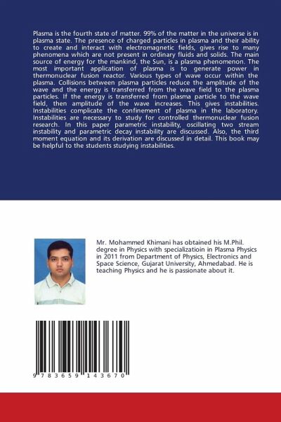 Plasma is the fourth state of matter. 99% of the matter in the universe is in plasma state. The presence of charged particles in plasma and their ability to create and interact with electromagnetic fields, gives rise to many phenomena which are not present in ordinary fluids and solids. The main source of energy for the mankind, the Sun, is a plasma phenomenon. The most important application of plasma is to generate power in thermonuclear fusion reactor. Various types of wave occur within the plasma. Collisions between plasma particles reduce the amplitude of the wave and the energy is transferred from the wave field to the plasma particles. If the energy is transferred from plasma particle to the wave field, then amplitude of the wave increases. This gives instabilities. Instabilities complicate the confinement of plasma in the laboratory. Instabilities are necessary to study for controlled thermonuclear fusion research. In this paper parametric instability, oscillating two stream instability and parametric decay instability are discussed. Also, the third moment equation and its derivation are discussed in detail. This book may be helpful to the students studying instabilities.