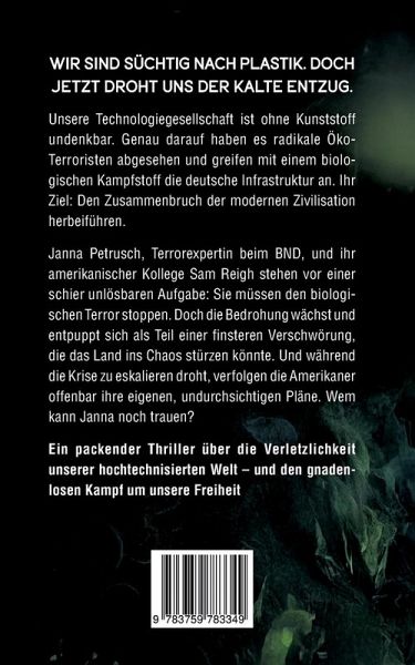 Öko-Terroristen greifen mit plastikzersetzenden Bakterien die technische Infrastruktur Deutschlands an. Sie wollen nichts weniger, als die moderne Gesellschaft zu Fall bringen. Janna Petrusch, Terrorexpertin beim BND, steht gemeinsam mit ihrem amerikanischen Kollegen Sam Reigh vor der Herausforderung, diese Bedrohung zu stoppen. Dabei stößt sie auf eine tiefgreifende Verschwörung, die die Freiheit des Landes bedroht. Zudem scheinen die Amerikaner eigene Pläne zu verfolgen. Wem kann Janna noch trauen?