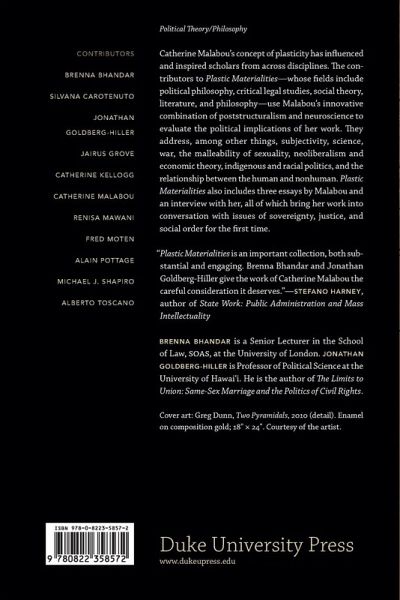 Catherine Malabou's concept of plasticity has influenced and inspired scholars from across disciplines. The contributors to Plastic Materialities-whose fields include political philosophy, critical legal studies, social theory, literature, and philosophy-use Malabou's innovative combination of post-structuralism and neuroscience to evaluate the political implications of her work. They address, among other things, subjectivity, science, war, the malleability of sexuality, neoliberalism and economic theory, indigenous and racial politics, and the relationship between the human and non-human. Plastic Materialities also includes three essays by Malabou and an interview with her, all of which bring her work into conversation with issues of sovereignty, justice, and social order for the first time. Contributors. Brenna Bhandar, Silvana Carotenuto, Jonathan Goldberg-Hiller, Jairus Victor Grove, Catherine Kellogg, Catherine Malabou, Renisa Mawani, Fred Moten, Alain Pottage, Michael J. Shapiro, Alberto Toscano