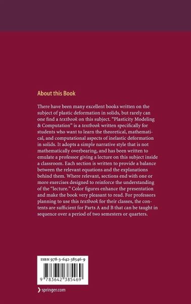 There have been many excellent books written on the subject of plastic deformation in solids, but rarely can one find a textbook on this subject. "Plasticity Modeling & Computation" is a textbook written specifically for students who want to learn the theoretical, mathematical, and computational aspects of inelastic deformation in solids. It adopts a simple narrative style that is not mathematically overbearing, and has been written to emulate a professor giving a lecture on this subject inside a classroom. Each section is written to provide a balance between the relevant equations and the explanations behind them. Where relevant, sections end with one or more exercises designed to reinforce the understanding of the "lecture." Color figures enhance the presentation and make the book very pleasant to read. For professors planning to use this textbook for their classes, the contents are sufficient for Parts A and B that can be taught in sequence over a period of two semesters or quarters.